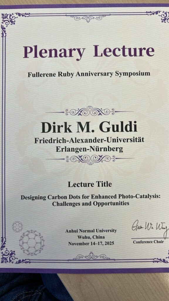 Prof. Dirk M. Guldi recently participated in the 2025 Fullerene Ruby Anniversary Symposium, held from November 14-17, 2025, at Anhui Normal University in Wuhu, China. He delivered an insightful lecture titled “Designing Carbon Dots for Enhanced Photo-Catalysis: Challenges and Opportunities.” The symposium was a vibrant gathering of eminent scientists, during which Prof. Guldi engaged with respected colleagues, including Profs. Yang, Echegoyen, and Komatsu. These interactions underscored the symposium’s dedication to advancing the field of carbon nanoscience through collaboration and innovation.