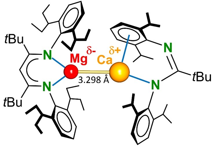 After several failures, now finally a first complex with a Mg-Ca bond has been isolated. The difficulty in such bonding is that both metals are electropositive and do not want to have valence electrons. Exactly this makes such bonds extremely weak and reactive. However, with the right combinations of two different ligands the first Mg-Ca bond could be realized. With circa 3.3 Å, the Mg-Ca bond is among the longest metal-metal bonds recorded. It is nearly of the same length as the bond between two large uranium metals, for example found in U2 trapped inside a C80 fullerene.