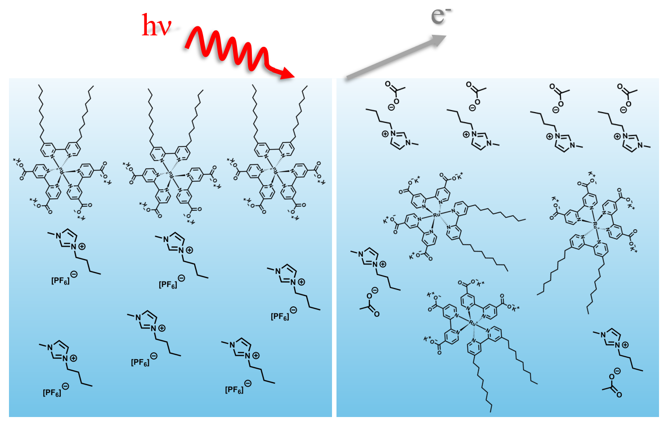 Influence of ionic liquid composition on surface enrichment of fluorine-free Ru complexes