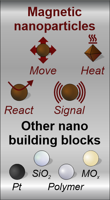 Size, shape and composition determine the ultimate properties of nanoparticles. Chemical synthesis control enables tailoring these. We synthesize and surface functionalize nanoparticles by means of bottom-up wet chemistry and subsequently use these as building blocks to assemble functional supraparticles. Our focus is on magnetic nanoparticles.