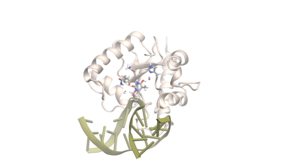 A DNA repair enzyme recognises a wrong or damaged base in the DNA and “cuts” it out such that subsequent enzymes can put in the correct base and repair the DNA. The animation shows the “cut”, i.e. breaking of the bond between sugar and base as computed by a QM/MM simulation of the reaction in the Enzyme-DNA complex.