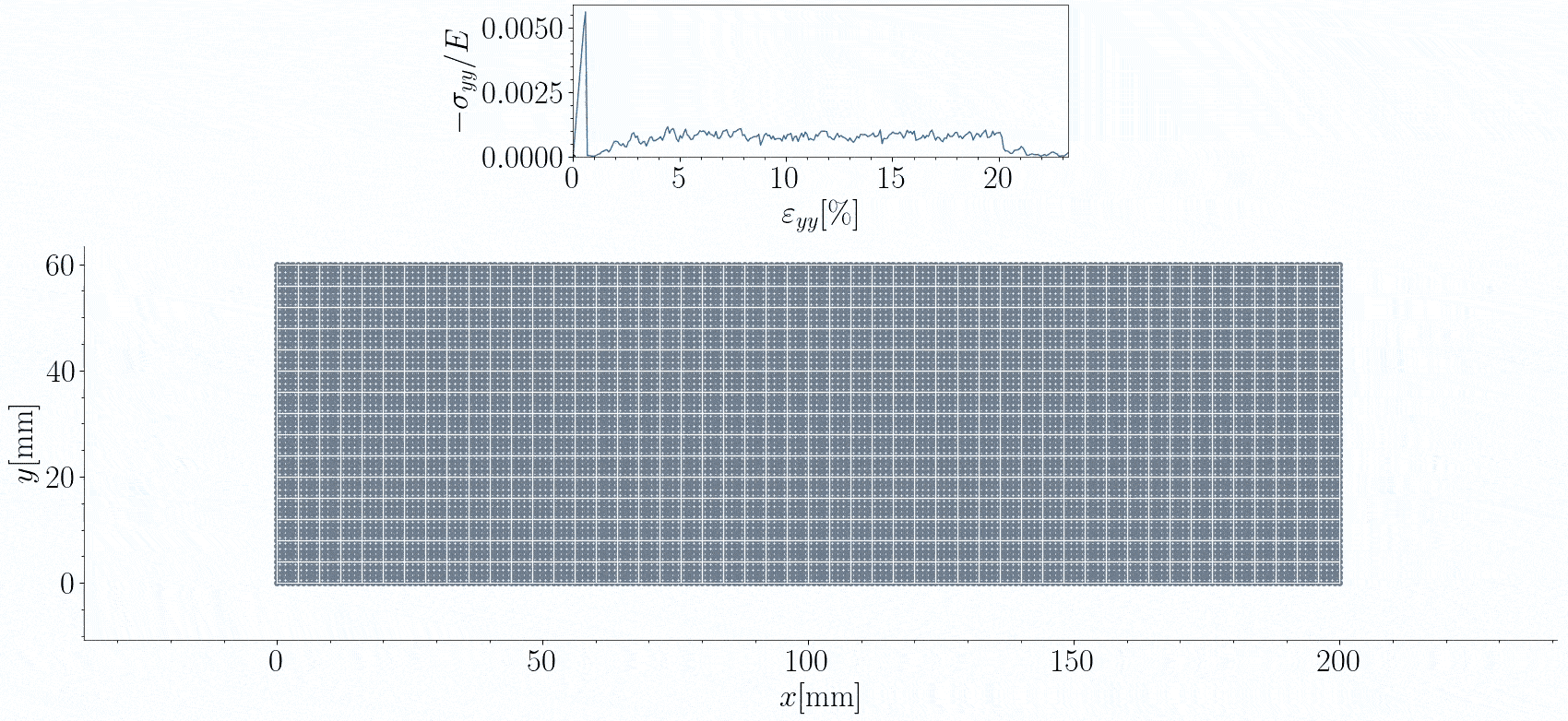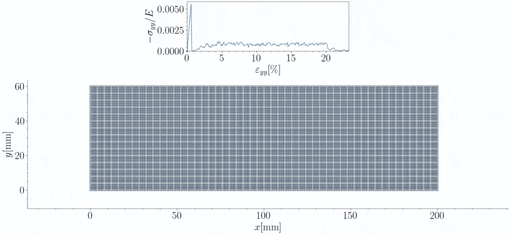 While the upper plot illustrates the forces opposing the compression loading in y-direction, the animation below shows the nucleation and propagation of cracks in a 2-D model of a highly porous, brittle material.